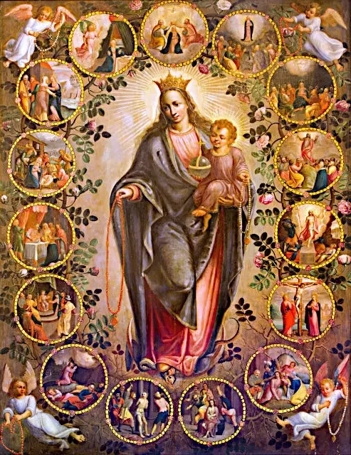 Oraison : « O Dieu, dont le Fils unique nous a obtenu le prix du salut éternel par sa vie, sa mort et sa résurrection ; faites, nous vous en prions, qu’honorant ces mystères au moyen du très saint Rosaire de la bienheureuse Vierge Marie, nous imitions ce qu’ils contiennent, et obtenions ce qu’ils promettent. »